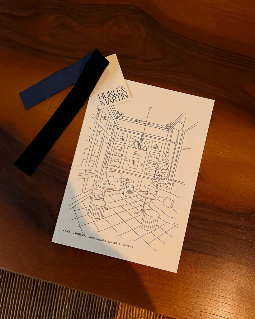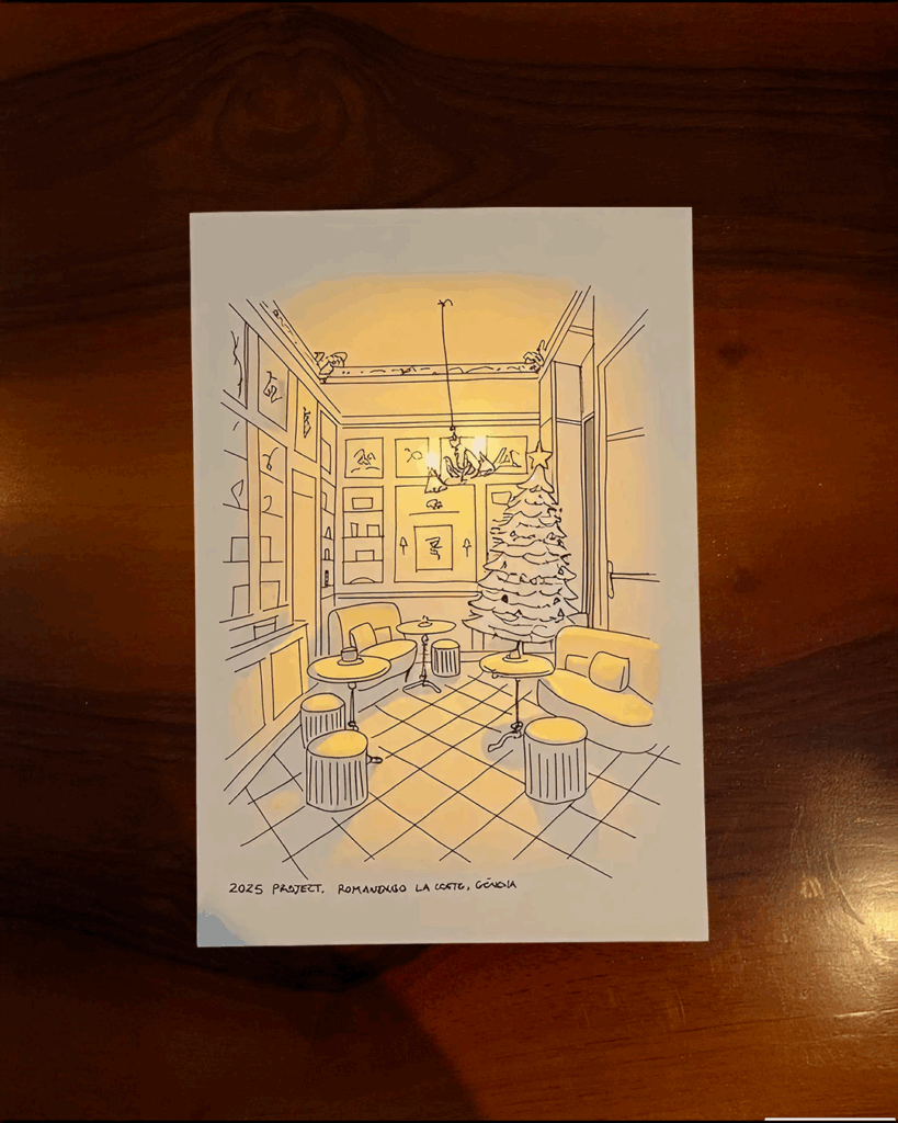 This Christmas, we invited our clients and friends to experience this shared universe: a hand-drawn sketch of one of our latest Romanengo confetterias in Genoa, paired with a wooden Romanengo box filled with their finest handcrafted chocolates and sweets. A simple gesture that brings both universes together—sketch and craft, idea and tradition.