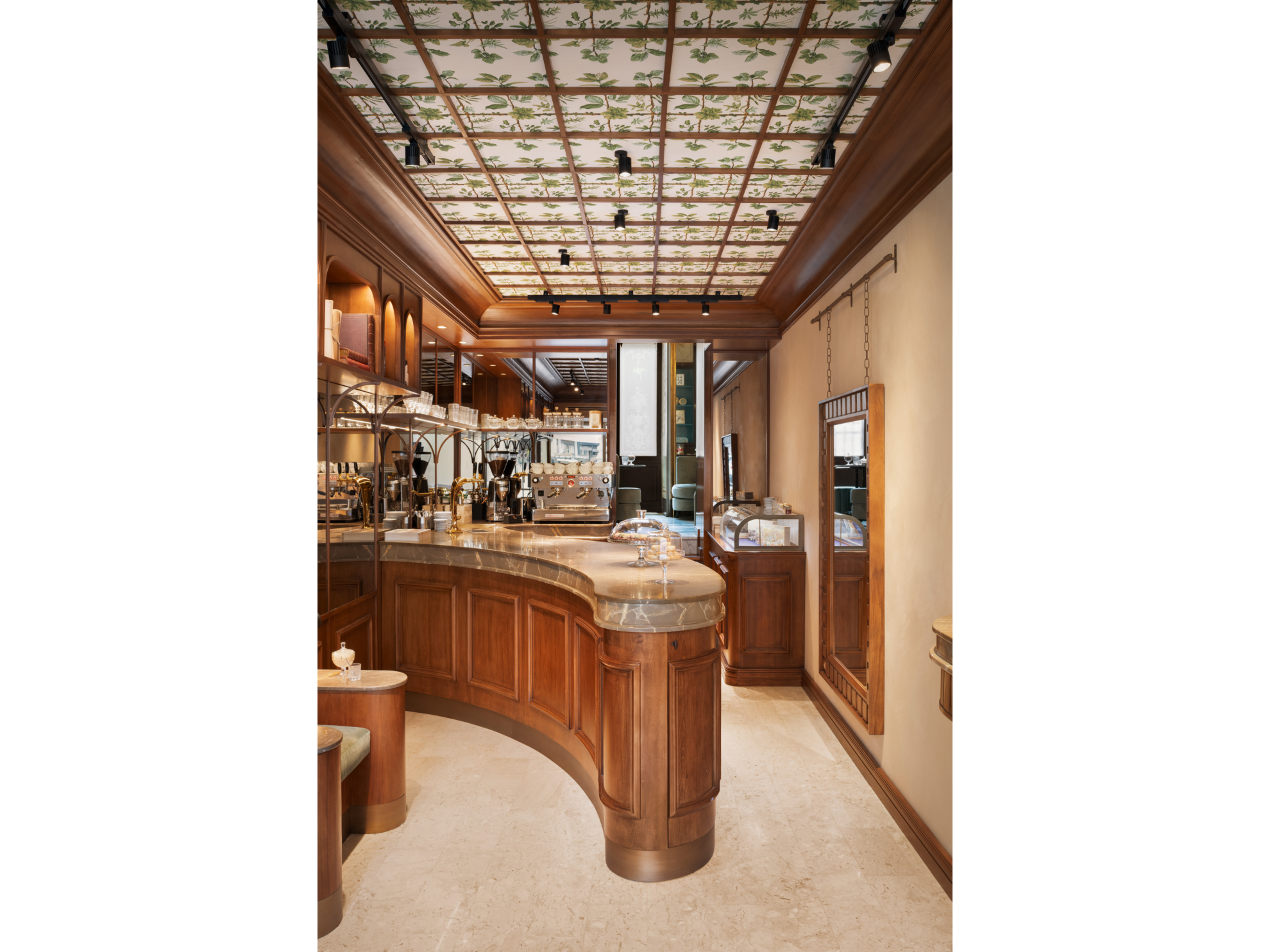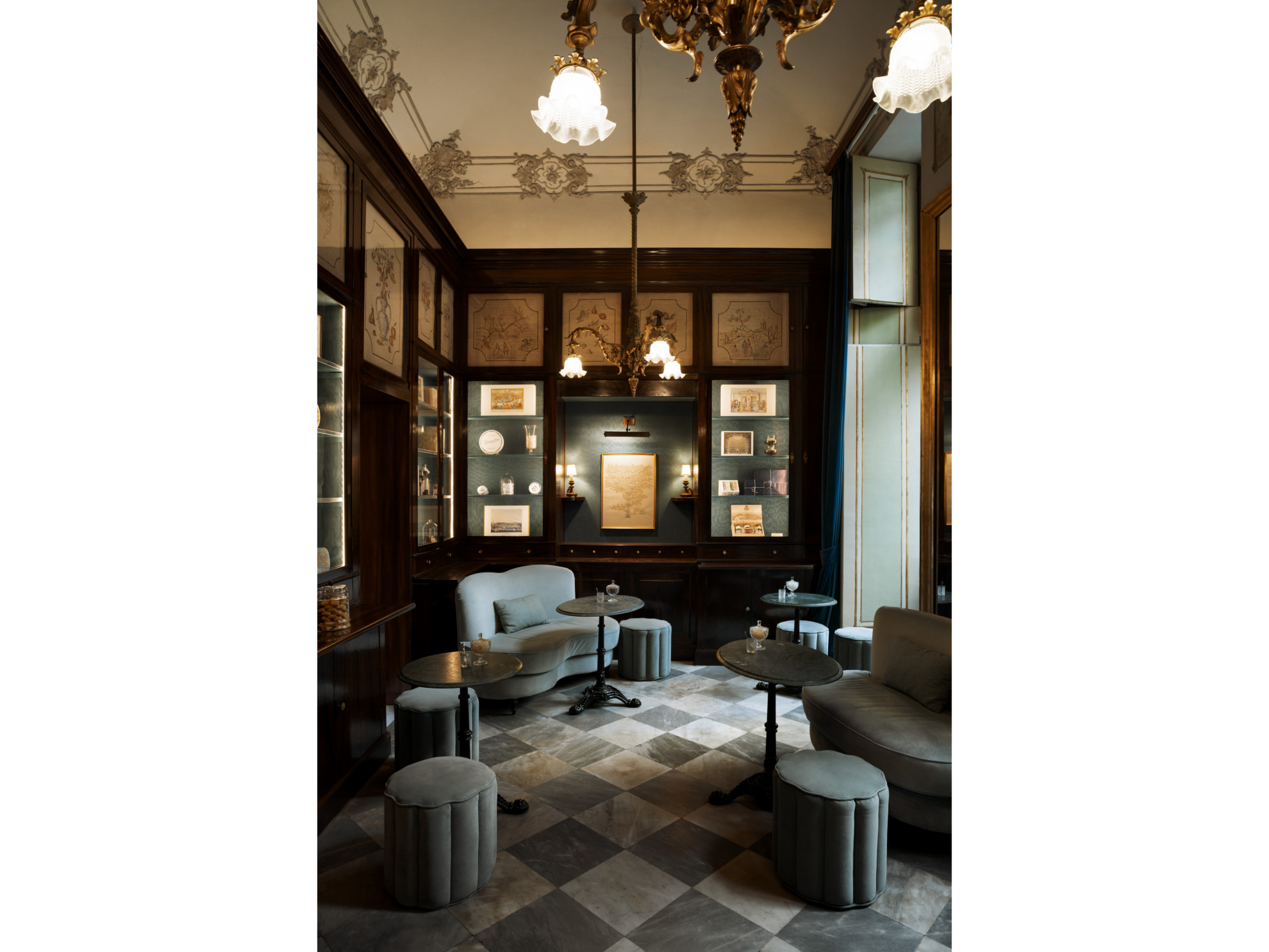 The space features original furniture veneered in Spiniero wood (West Indian Satinwood), hand-carved Palissandro Rio details, precious marbles, and restored bronze gas chandeliers.